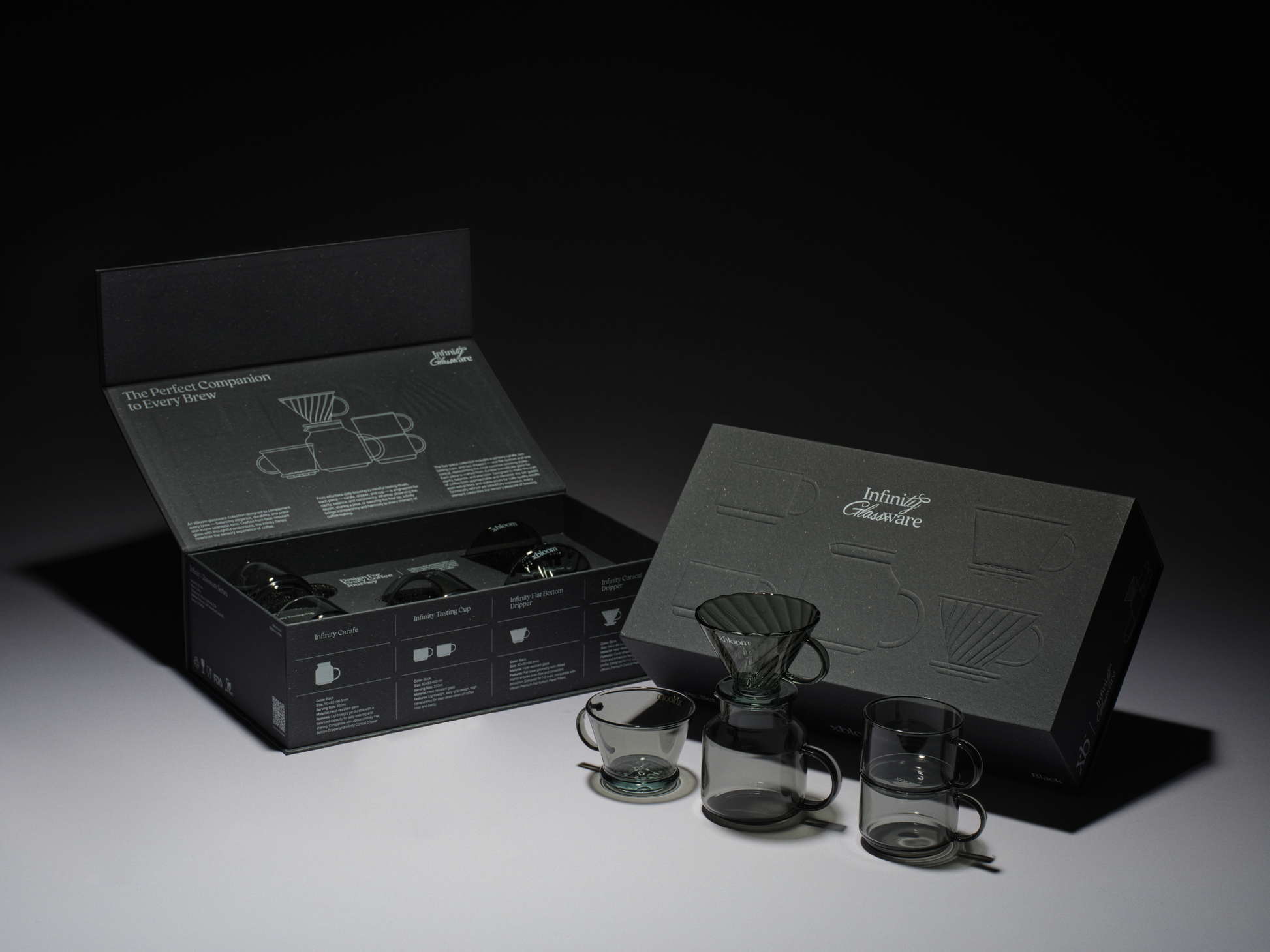 يضم الطقم إبريق إنفينيتي الحسي، وكوبي تذوق، ومرشحًا مسطح القاعدة، ومرشحًا مخروطيًا، وجميعها مصنوعة من زجاج بوروسيليكات عالي الجودة ومنفوخة يدويًا لتمنحك صفاءً بصريًا استثنائيًا، ومقاومة للحرارة، ولمسة فريدة تميز كل قطعة.